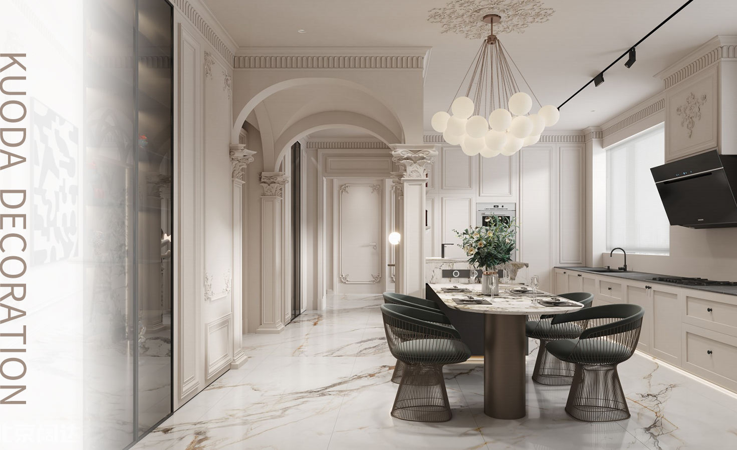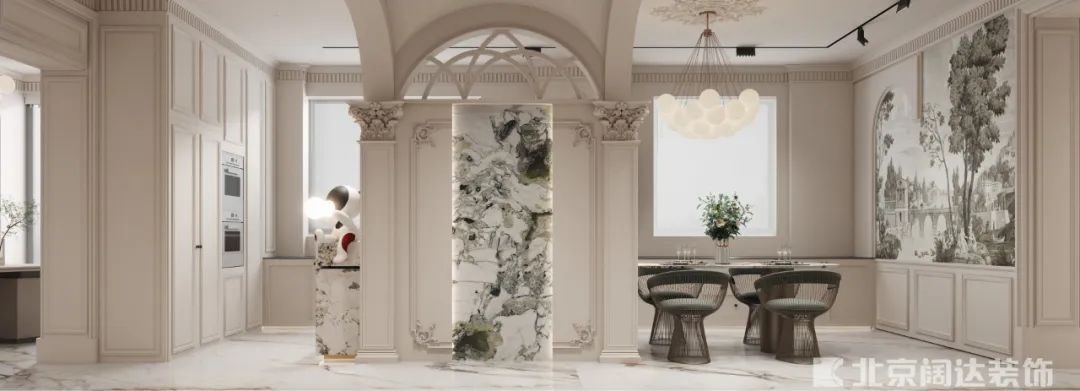 人間浪漫不過日出東方。把日出定格家中,一餐一食,皆溫柔。延續客廳的浪漫基調,復古的壁畫為餐廳融入美好氛圍感;絲絨與羊羔絨餐椅將法式的優雅完美表達。在功能上,增加島臺與餐邊柜,安裝小水槽和直飲機,縮短生活動線,提升家居舒適度。
