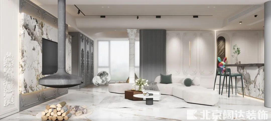 嵌入式設計的電視背景墻,結合巖板和法式線條護墻板,懸掛壁爐浪漫又不失質感,既保留了法式的柔和,也融入了現代的大氣。圓弧形的吊頂上,嵌入式無主燈散落在“星盤”里,給予生活最自然浪漫的光影支持。