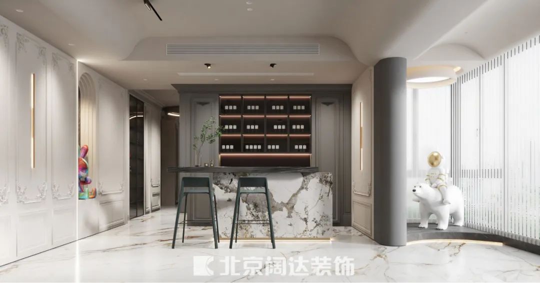 客廳擁有奢闊的開間和采光,這里是孩子們的玩樂天地,也是家人互動交流的空間。將開放式品酒區、兒童玩耍區和陽臺融為一體,讓公區盡量擴大,釋放出充足的活動空間。