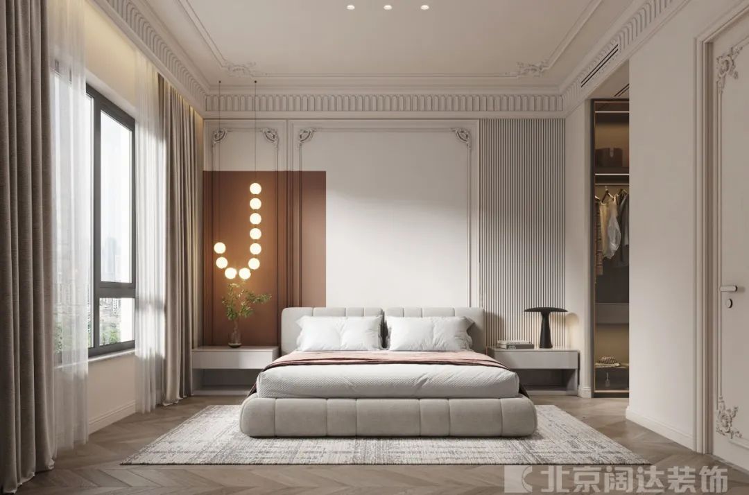主臥床頭背景軟包與巖板組合,豐富空間的立體和層次感。奶油色藝術涂料似將月光打翻傾瀉一室,燈線于頂部游走,個性臺燈守護,夢幻的紗簾將屬于臥室的柔軟和浪漫氛圍拉滿,成全每一晚的好眠。