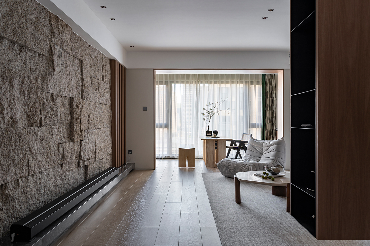 客廳背景處利用了天然毛石的質感,體現自然的主題。