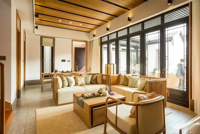 會客廳運用木質和淺色棉麻材質結合,家具可以選用充滿中式古韻設計的沙發、桌椅、茶幾,帶著濃厚的東方清雅格調,體現著人與自然和諧相處的態度。
