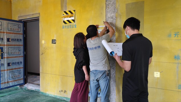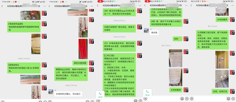 客戶、設計師、管家及水電師傅,現(xiàn)場確定水電位置,管家以文字加圖片形式發(fā)送至微信服務群,告知客戶今天交底的內容,待客戶確認后方可施工。