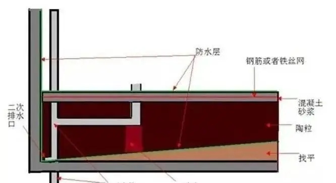 這里的平并不是水平的平,為了方便積水能夠順利的流入二次排水孔,下沉層的地面要做一個坡度,也就是二次排水孔的地方最低,然后其他地方緩緩升高。